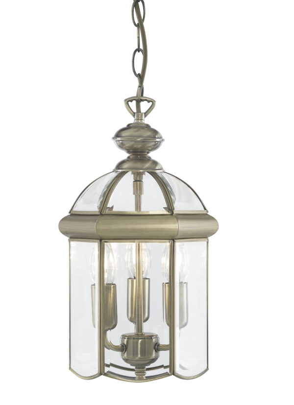 Traditional style lantern with clear bevelled glass panels in antique brass finish.