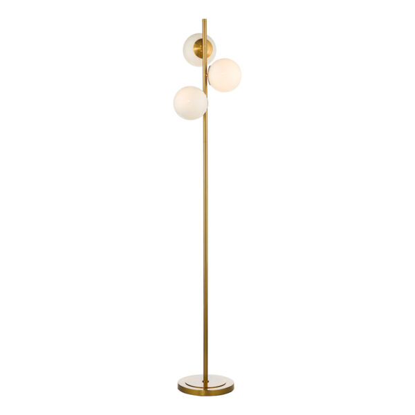 Three oversized glass opal globes adorn a solid natural brass stem. Operated via foot switch, this lamp is hugely practical and is the perfect statement piece for any lounge, dining room, or bedroom!