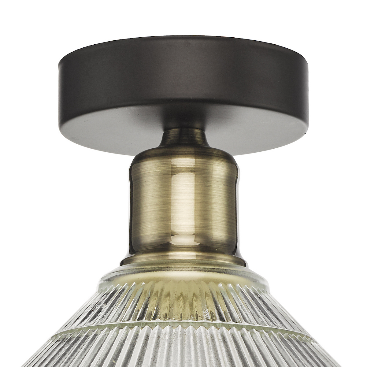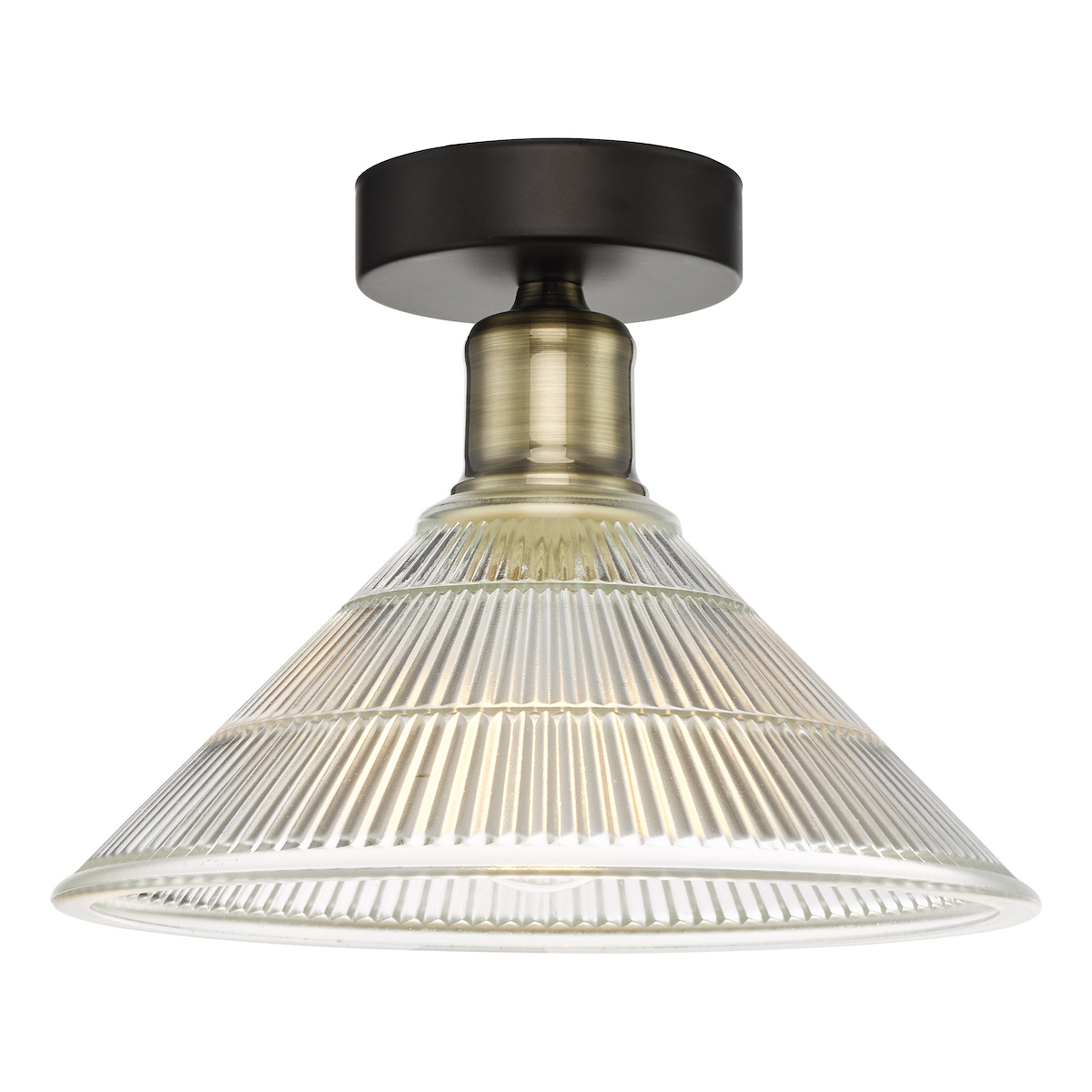 The Boyd Flush Ceiling Light combines vintage industrial charm with modern functionality, featuring a striking prismatic glass shade and antique brass detailing.