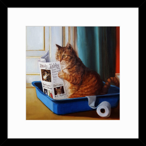 A comical image of a ginger cat reading the 'daily tabby', whilst going about it's daily business! Complete in a black frame.