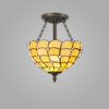 This Ophelia 30cm Tiffany Uplighter features a domed shade, assembled from beige sheened glass shapes and black outlines are adorned with multiple clear crystal tear drops. Suspension is antique brass.