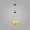 This Ophelia 40cm Tiffany Uplighter features a domed shade, assembled from beige sheened glass shapes and black outlines are adorned with multiple clear crystal tear drops. Suspension is antique brass with 3 lights and can be adjusted for height at point of installation.