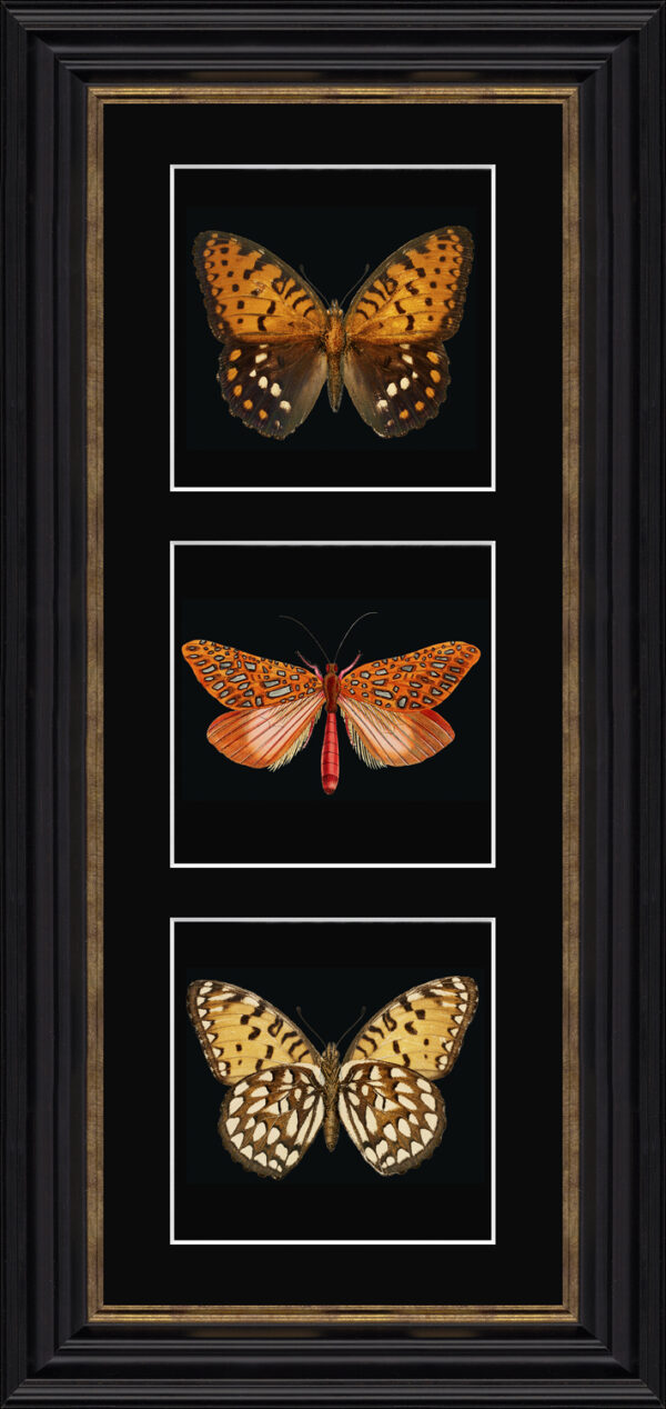 A trio of orange toned butterflies on a dark background to make the colours truly pop. Complete with black frame and gold detailing.Artist: Artko Designs