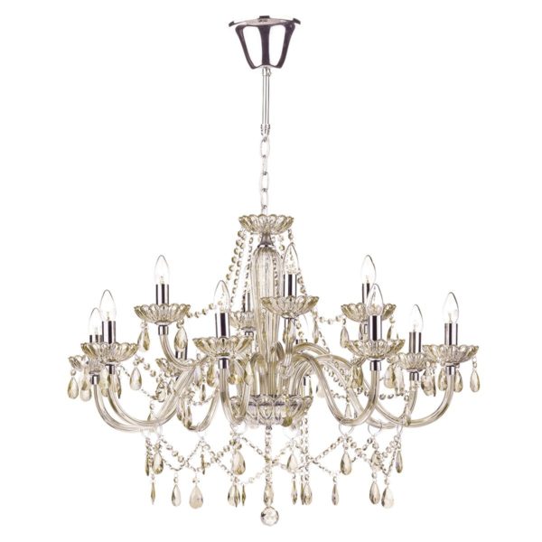 A stunning crystal chandelier with polished chrome accents and champagne coloured glass. The stunning draping beads and faceted droplets would look genuinely fabulous in either a modern or traditional setting.