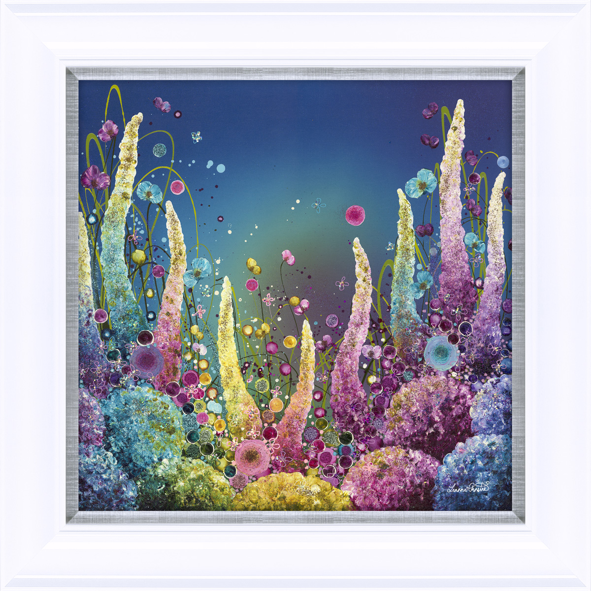 A fabulous image of wild flowers using vibrant colours and dark background. Complete with a white frame.
