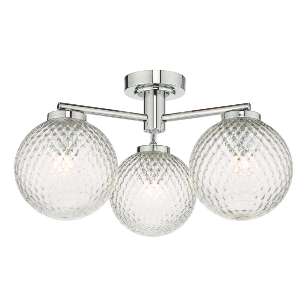This modern semi flush fitting finished in polished chrome, and features 3 diamond textured glass shades. When illuminated, the flush fitting casts a wonderful glow across your bathroom. It's refined detail is sure to have an impact on any low ceiling spaces in your home.